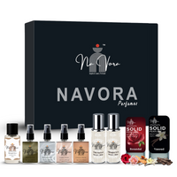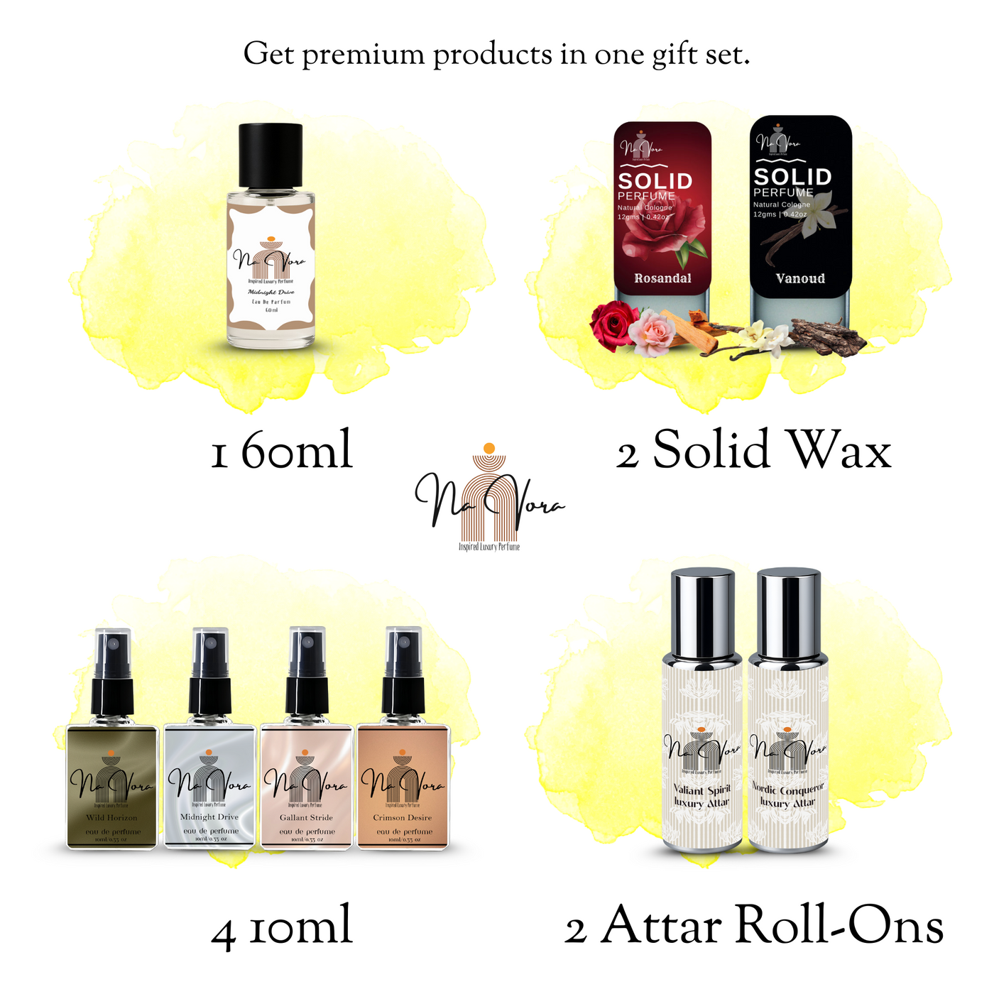 Navora Men's Signature Gift Set: 60ml EDP, 4x10ml Mini Sprays, 2x12gms Solid Perfumes, and 2 Attar Roll-Ons.
