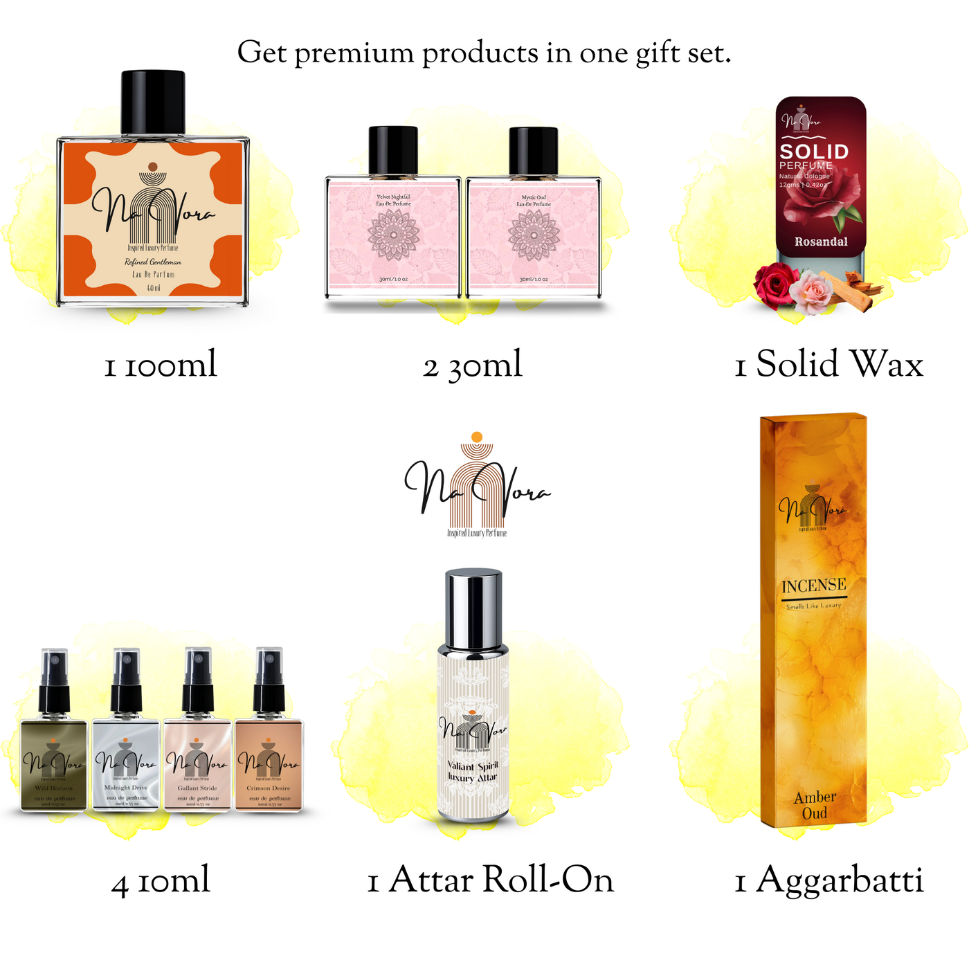 Navora Men's Ultimate Gift Set: 100ml, 2x30ml, 4x10ml EDPs, 12gm Solid Perfume (Rosandal), Attar Roll-On, and Amber Oud Incense.